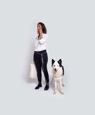 The versatile Army Green Hands-Free Leash can be used in 4 different ways. This hands free dog leash can be used as a waist leash and worn around your waist or as a crossbody leash- across your chest.