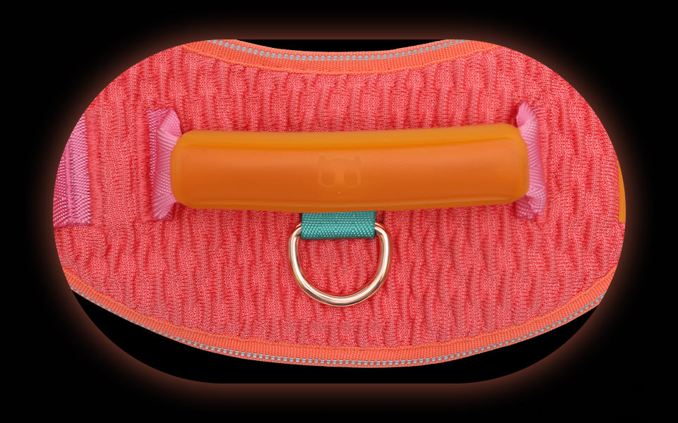 Reflective material woven along entire harness edge enhances safety on nighttime walks.